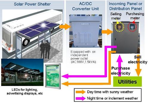 Across Japan energy reduction countermeasures are starting to be made in earnest due to the effects of the March 11 earthquake and resulting nuclear power situation. Furthermore, environmental awareness in urban planning has also been receiving a lot of attention. The electricity generated from the shelter's solar power generating system can be used for surrounding electrical needs, such as lighting for advertising displays, with excess power being sold to the power utility companies, thus helping to meet expected power shortages in Japan during the summer. Furthermore, the shelter uses low-energy LED lighting to reduce both power consumption and CO2 emissions at night.