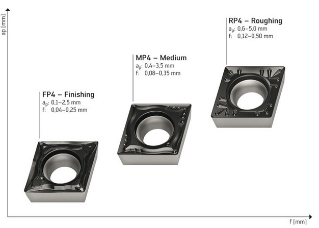 RP4 has a very stable cutting edge for roughing forged steel parts or casting skins. This insert is first choice for maximum machining volumes. The FP4 and MP4 geometries were optimised in particular for short chip breaking.