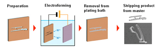 Electroforming is a metal forming process that forms thin parts through the electroplating process. The parts are produced by plating a layer of metal onto a base form (master). Once the plated layer has been built up to the desired thickness, this newly formed part is stripped off the master substrate. Electroforming enables high-precision production of extremely small, thin and fine parts. OMRON also produces dies using microfabrication technology to meet more exacting needs for shapes and sizes, thus enabling transfer of a pattern with submicron-scale (1/10,000mm) accuracy.