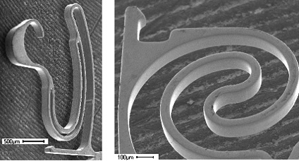 With a pressing process, the bending radius (R) is limited to a level twice that of the plate thickness (R/plate thickness = 2). By contrast, electroforming technology can produce finely curved shapes with a radius as small as 40µm. This makes it possible to create new and extremely complex shapes that were unimaginable using the conventional pressing process.