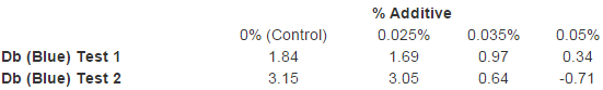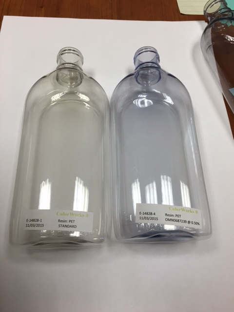The new liquid additives were tested on a production scale blow-molding machine in Clariant's facility in East Chicago, IL. Bottles made using 25% recycled PET and 75% virgin PET and no brightening additive were compared against bottles made with the same PCR resin and the additive in concentrations of 0.025, 0.035 and 0.05%. While the unmodified bottles showed significant yellowing, all the bottles made with the HiFormer additive were visibly brighter (less yellow and more blue). This is evident in the following spectrophotometer readings: