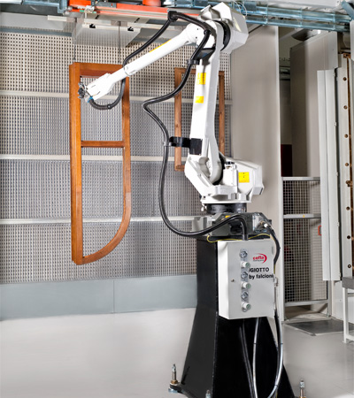 "Once again - says Alberto Maestri, managing director of Cefla Finishing - we can proudly say that our designers have anticipated the times and have marked a new step in the technological innovation of spray painting". This innovative system makes painting products with large shapes and dimensions easy, with up to over 20 cm of thickness and widths up to 1.3 metres. One of the strengths of iGiottoApp Twin is its flexibility, which allows the user to work with both robots simultaneously on the same items, sharing the work area while avoiding collision thanks to a precise automatic calculation of their trajectories. The two robots can work synchronously on identical items, independently on different products or continuously on objects of any type, by integrating the work of one and the other without ever stopping the production flow. Moreover, iGiottoApp Twin exploits a precise 3D reading system with a high-performance scanner, able to identify the shapes and position of the products to be painted. Thanks to the software system completely developed by Cefla, it is also able to calculate the possible trajectories of application for pieces immediately after they are scanned.