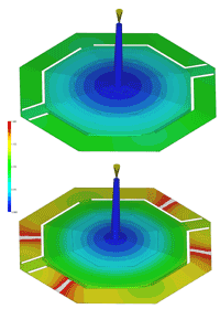 Improved flow properties can be exploited in a variety of ways. Delicate structures and thin-walled parts can be filled more easily and reliably, leading to a drop in the reject rate, particularly in the case of complex geometries. The significantly-reduced injection pressure means that the moulds are subjected to much less wear. This increases operating times and reduces maintenance costs. Improved flow means that less injection and filling pressure is required for large components in particular, so that the locking force can be reduced, enabling processors to manufacture their products on smaller machines. In addition, fewer injection points or hot-runner nozzles are required on moulds. Despite the thinner walls, it is even possible to produce components with a comparatively high glass-fibre content.