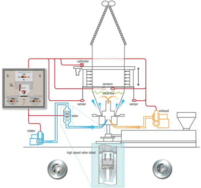 Patented split sensors enable the air flow intake and exhaust to react to the slightest changes in bubble size at or below the frost line where the bubble size is not yet final. A set of two non-contact ultrasonic sensors are aimed at the bubble below the frost line where size changes, particularly with low melt-strength resins like metallocenes and LLDPEs. This allows an immediate correction by the intake/exhaust blowers via the AC inverter-controlled blowers. For the more critical layflats, this is done via the high-speed servo reaction control valve.