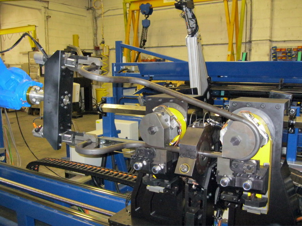 The automated production cell comprises a tube bundle loader, multifunction processing station, intermediate dual-arm loader, bending machine and an articulated robotic handler. All these stages are controlled by a central PC. As soon as the bundle loader's hopper is filled and the operating program is selected, the cell operates completely automatically. The bundle loader feeds tubes individually to the multifunction station, which performs weld seam detection, tube orientation and centralising, and all-electric hole punching. The tube is then transferred to the bending machine by the dual-arm loader, and after being bent to shape is removed by the robotic handler and placed in a multiple rack storage scheme.