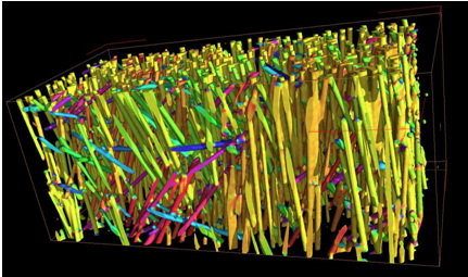Captions Figure 1 - Visualization of the fiber orientation by means of 3D-Computer tomography. The image resulted from the collaboration between SIGMA Engineering GmbH, Germany and Volume Graphics, as part of the research of the interdependence between fiber orientation and viscosity in SIGMASOFT®.  Figure 2 - Without the coupling of the fiber orientation and the viscosity, the thickness of the middle layer in fiber reinforced polymers is incorrectly predicted. This results not only in an inaccurate prediction of the shrinkage and warpage behavior but also affects the reliability of subsequent integrative simulations. |