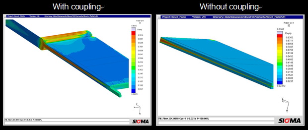 In Figure 2, the fiber orientation perpendicular to the flow direction predicted by the simulation is compared with and without consideration of the interaction between fiber orientation and viscosity. The differences in the prediction of the middle-layer are clearly visible. The influence over the final mechanical properties is evident.