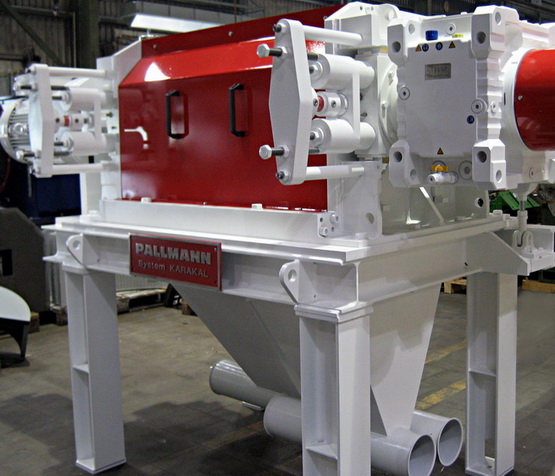 Karakal is a type of twin-roll mill that has been designed specifically for recycling waste from production of technical parts, as well as waste arising from retreading truck tyres. It accepts material that has been pre-cut to a particle size of 4 mm or less, and which is fed to it continuously by a series of screws positioned along the gap between the rollers. Pallmann has applied for several patents on technology incorporated into the equipment.