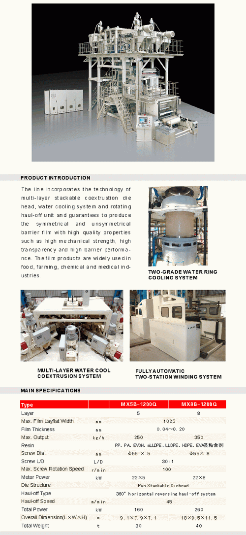 | Triple Bubble High Barrier Shrink Blown Film Line Guangdong Jinming Machinery Co., Ltd. High barrier heat shrinkable film is widely used in packaging of meat products(ham, sausage, fresh meat and poultry meat), dairy products(cheese and butter), ... | | Three-layer Coextrusion Blown Film Line Guangdong Jinming Machinery Co., Ltd. To achieve the high output performance of the line, the extruding system has been improved with force-feeding function, precision ceramic heater, precision ... |
