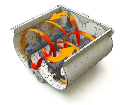 Three-dimensional mixing with the BHS twin-shaft batch mixer (DKX) The twin-shaft batch mixer moves the entire mixture in a three-dimensional spiral motion. There is also an intense exchange of materials in the turbulent zone where the two mixing cycles overlap. The energy applied is optimally converted into intense relative movements of the entire mixture. Thanks to the optimized design and arrangement of the mixing tools, you will achieve consistently outstanding mixture homogeneity batch by batch, with very short mixing cycles. |