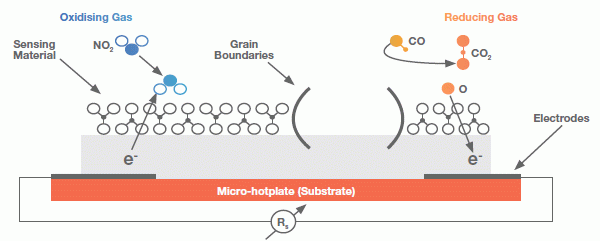 Our Micro-hotplates are suspended in a high reliability membrane and act as heater elements for a metal oxide-based sensing material. The Micro-hotplates contain electrodes that measure the resistance of the sensing material. Reactions to target gases cause material resistance changes at temperatures between 200oC to 400oC. For reducing gases such as Carbon Monoxide (CO) a reaction takes place with the pre-adsorbed oxygen of the sensing material which decreases the resistance of the sensor. For oxidising gases such as Nitrogen Dioxide (NO2) the resistance increases. The magnitude of the resistive changes depends on the metal oxide composition/structure and the operating temperature of the sensor. Figure 1 illustrates the MOX gas sensor structure and how the resistance of the sensing material changes when gas molecules react on the surface.