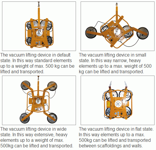 The really robust central pivot bearing allows turning the work pieces freely (360 degree). For the transport or the special operation behind scaffoldings the beam, which is rotatable (90 degree), can be detached. Additionally, the vacuum lifter can be expanded and reconstructed in different positions with extensions.