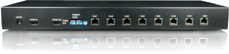 The 2 input HDMI source (only 1 input can be used at a time) can be duplicated and distributed to up to 8 HDMI enable displays through cost effective Cat-5/5e cables and RJ-45 to HDMI mini-extenders; the high definition HDMI (video/audio) can be transmitted to different locations over a long distance