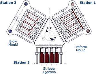 The heart of the injection Blow moulding process is a triangular rotary table, which indexes in 120? steps. Core rods mounted on the face of the table form the inside of the hot parison (or preform) that is later blown into the finished container.